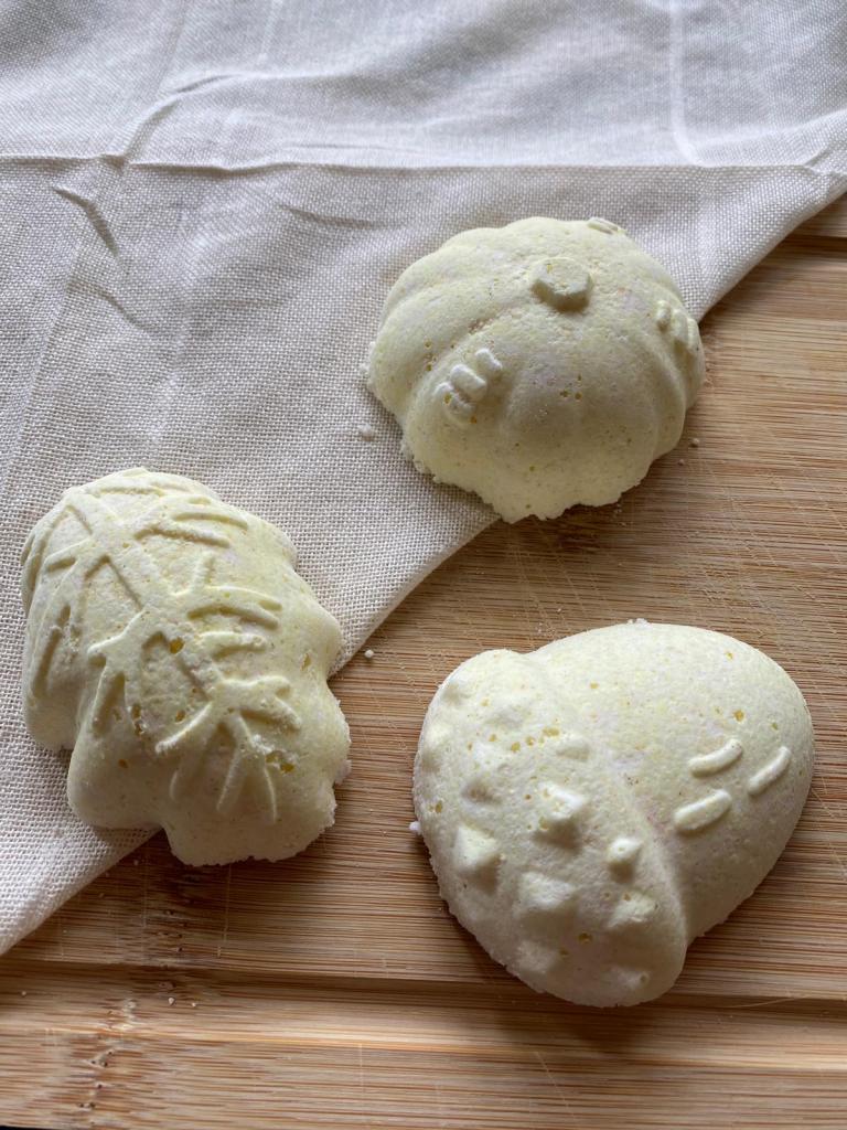 Zoals de foto van de herfst bruisballen hierboven, met een klein lichtgeel tintje (van kurkuma) omdat mijn zoontje gele bruisballen wilde maken, maar na een vleugje poeder besloot hij dat ze toch wit moesten blijven =)