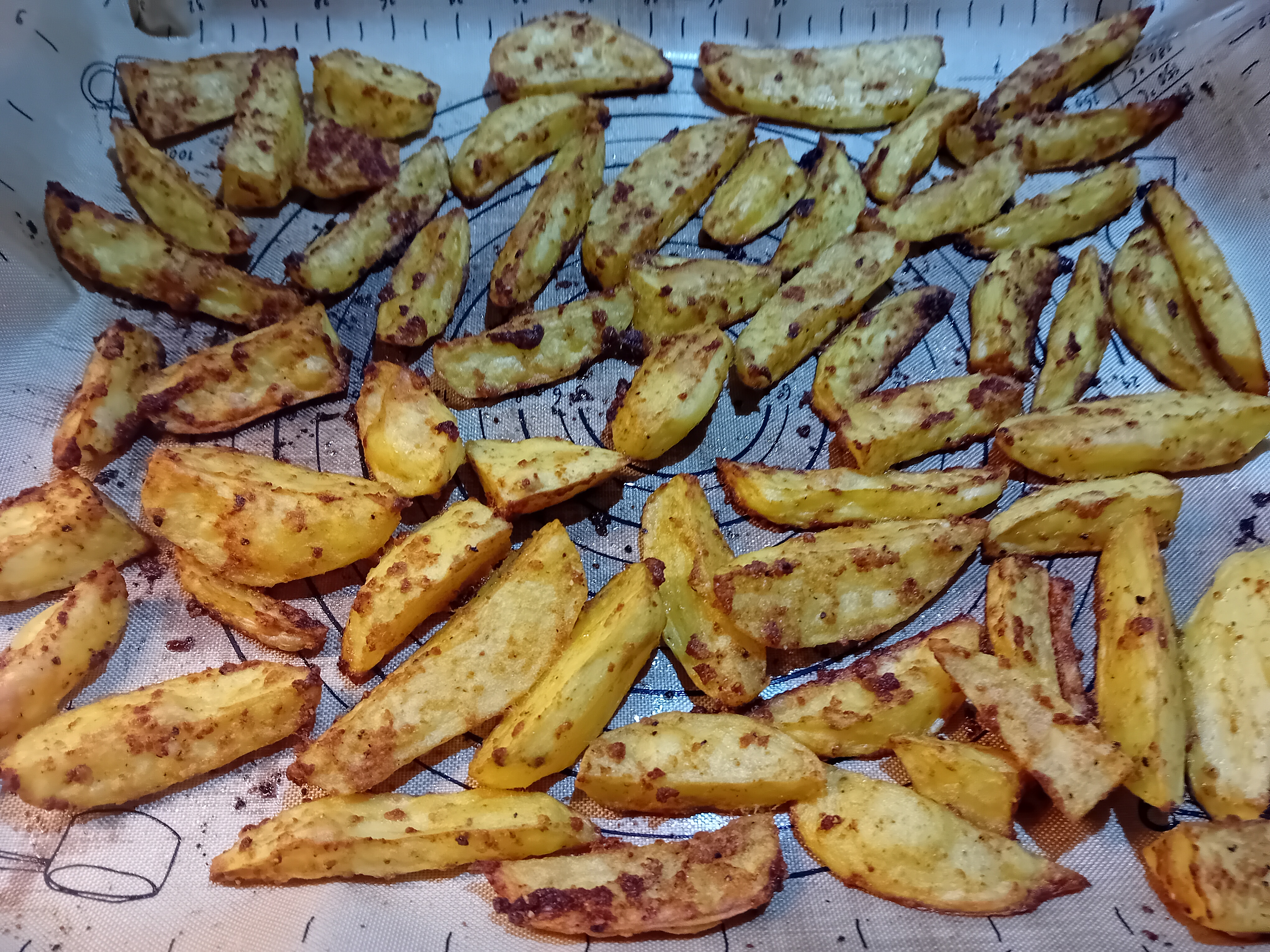De smaak en geur doen enigszins denken aan kaas, en deze aardappelpartjes worden bij ons in huis dan ook cheesy potatoes genoemd.