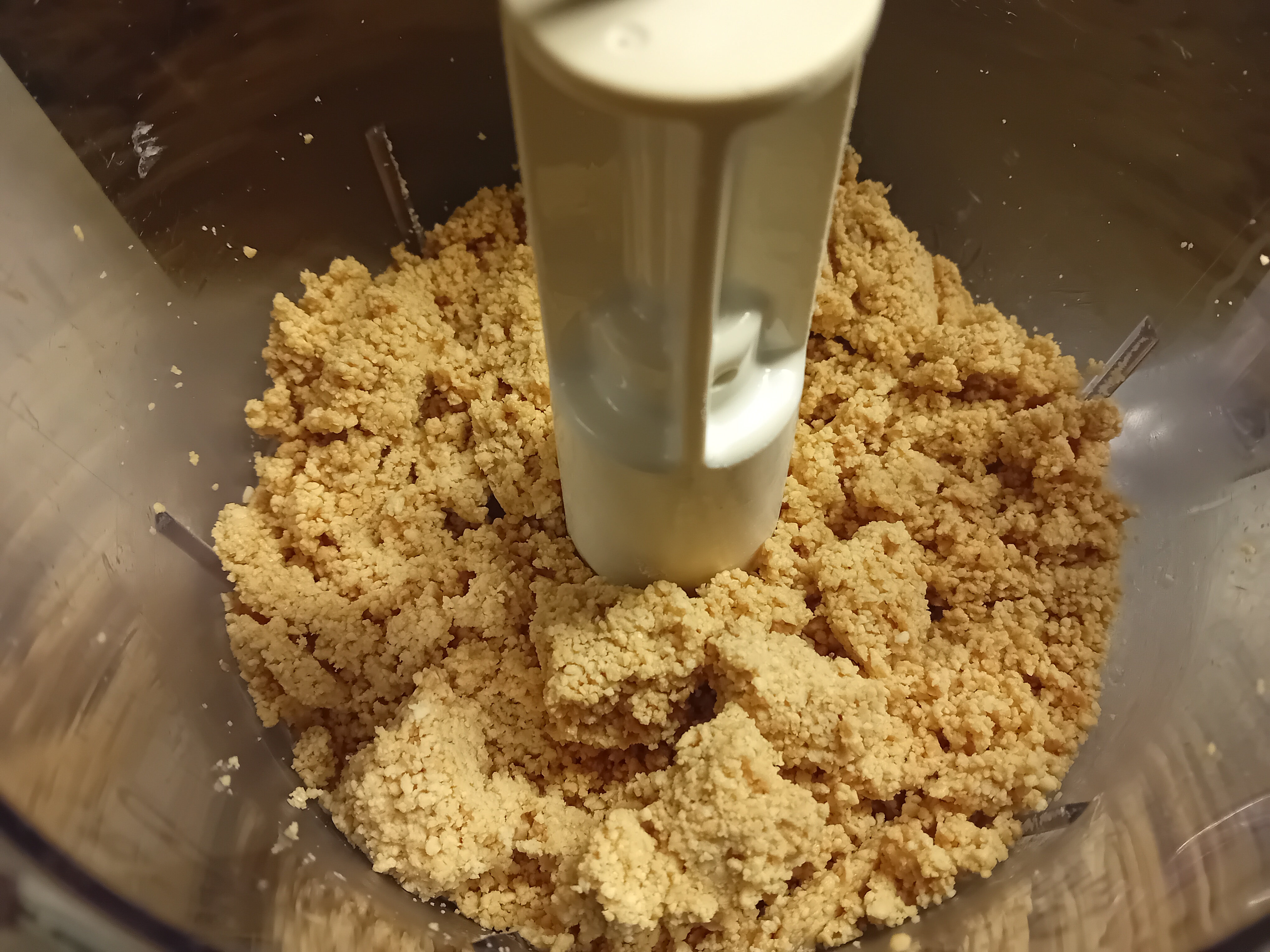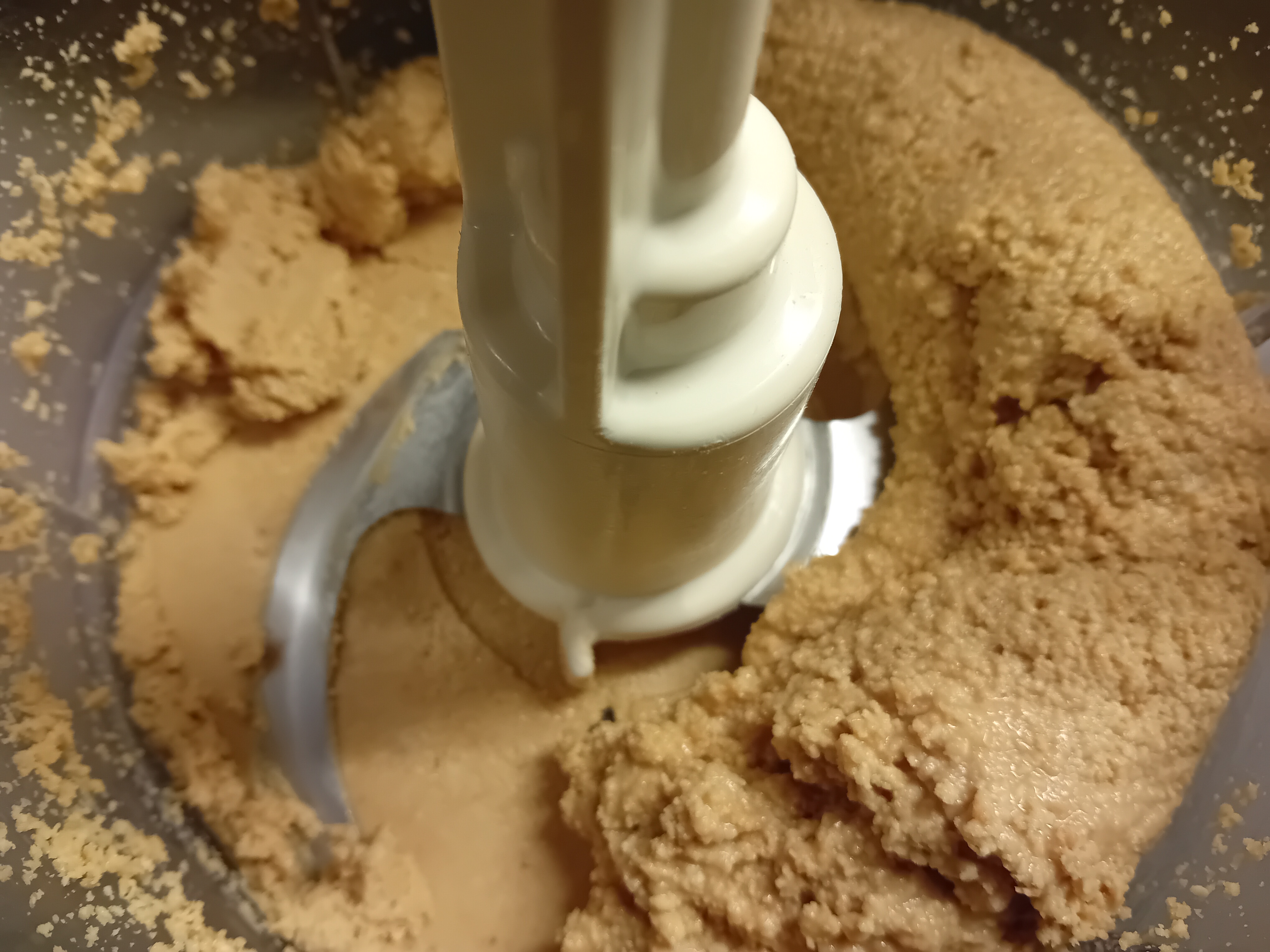 In eerste instantie krijg je kleine stukjes pindagruis, en lijkt het er niet op dat er een pasta zal ontstaan, maar ga gewoon door. (zie foto’s hieronder)