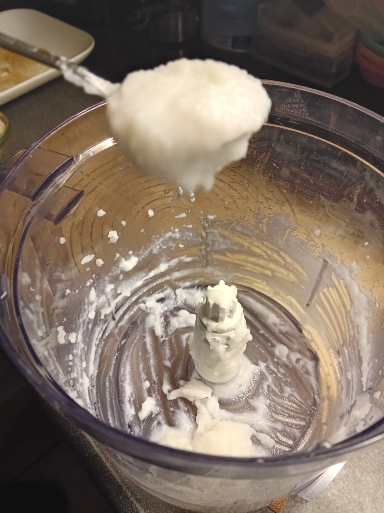 3. Maak er met behulp van de keukenmachine een mooie fijne egale rijstpap massa van. Het wordt een kleverige massa (zie foto hieronder). Voeg indien nodig wat extra water toe.