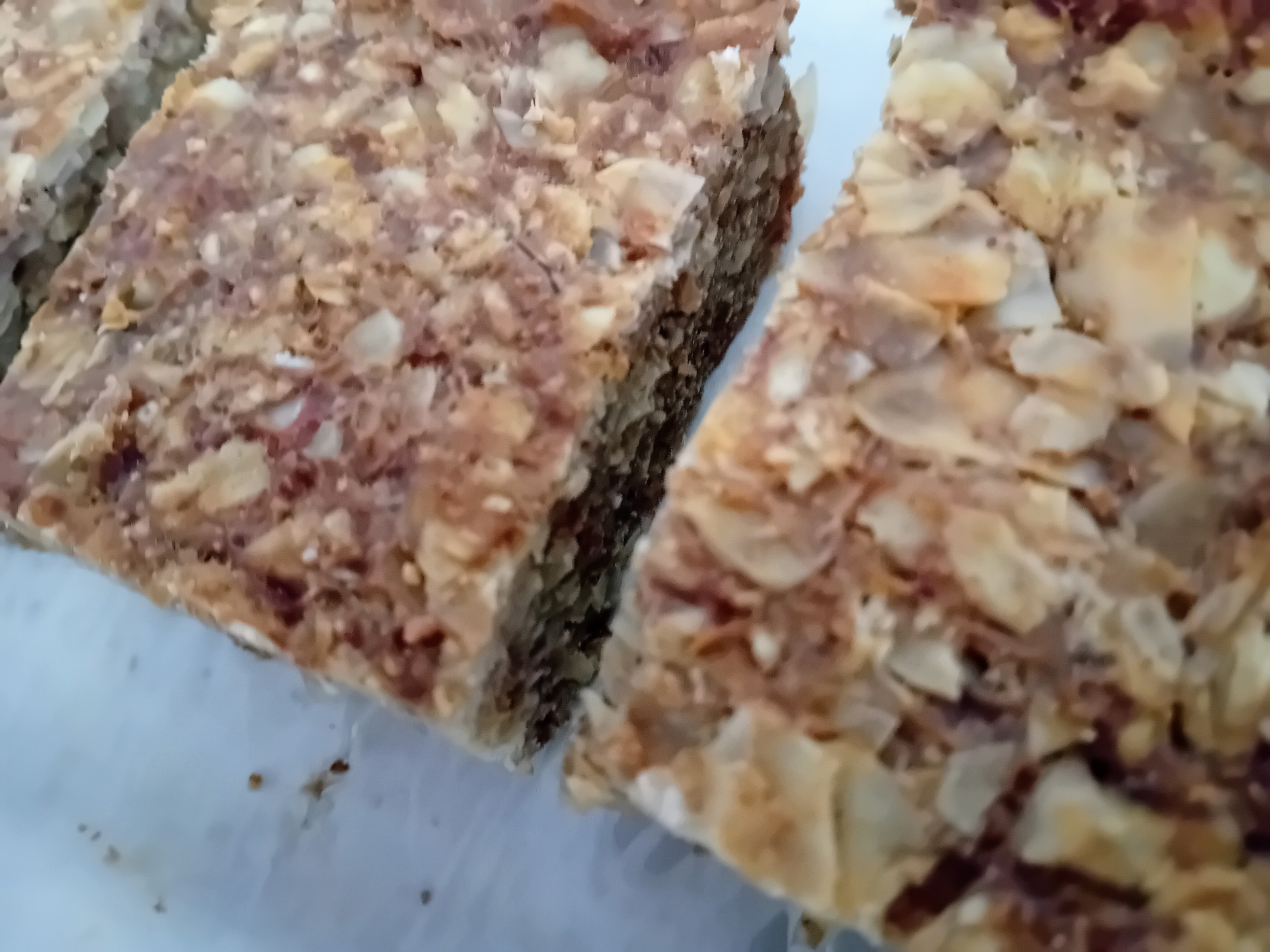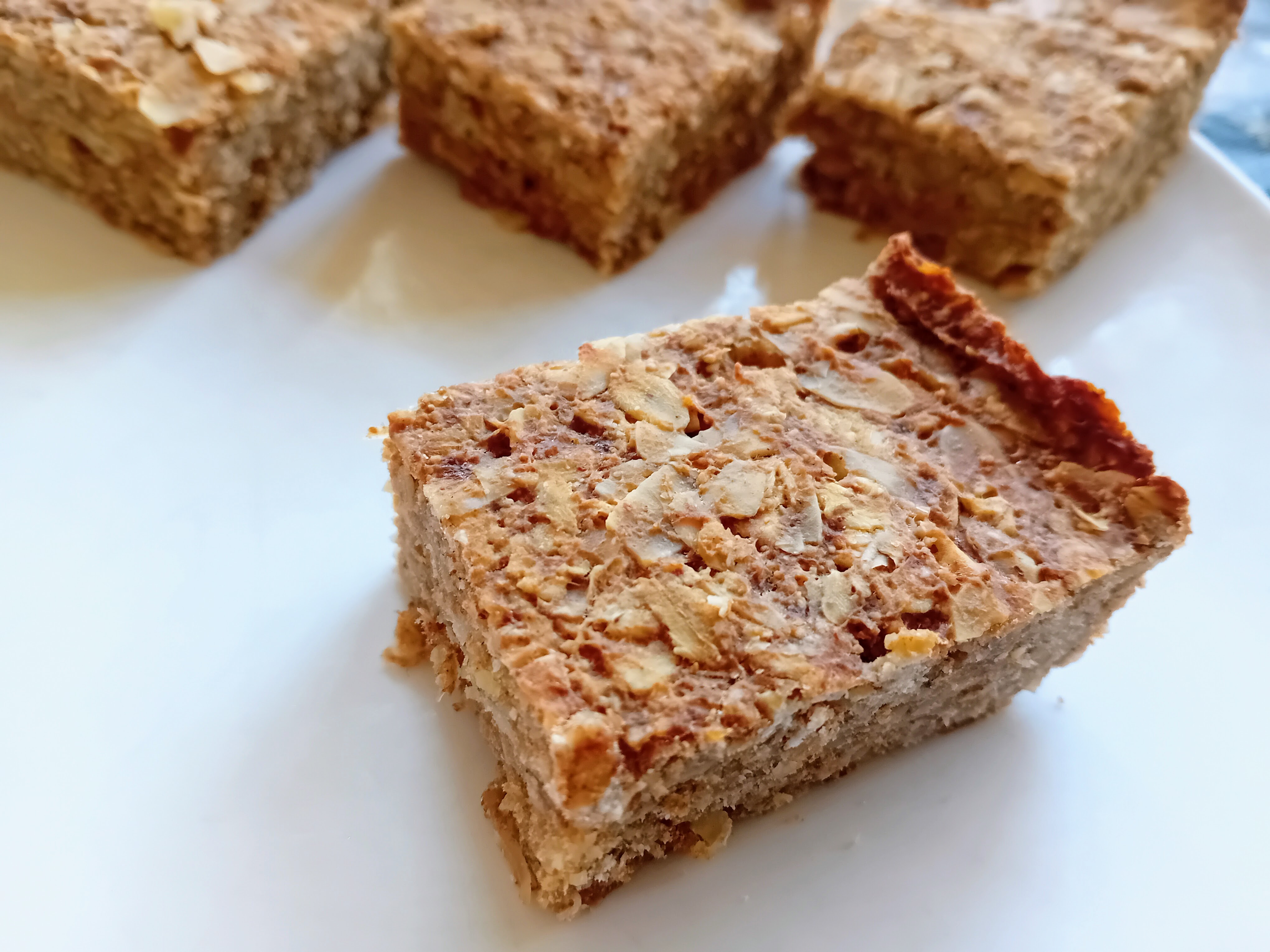 Deze voedzame havermout repen zijn heerlijk als tussendoortje. Door de haver zijn ze erg vullend met een goede bite, en dat wordt verder aangevuld door heerlijke laagjes amandelschaafsel en de natuurlijke zoetheid van rijpe bananen.