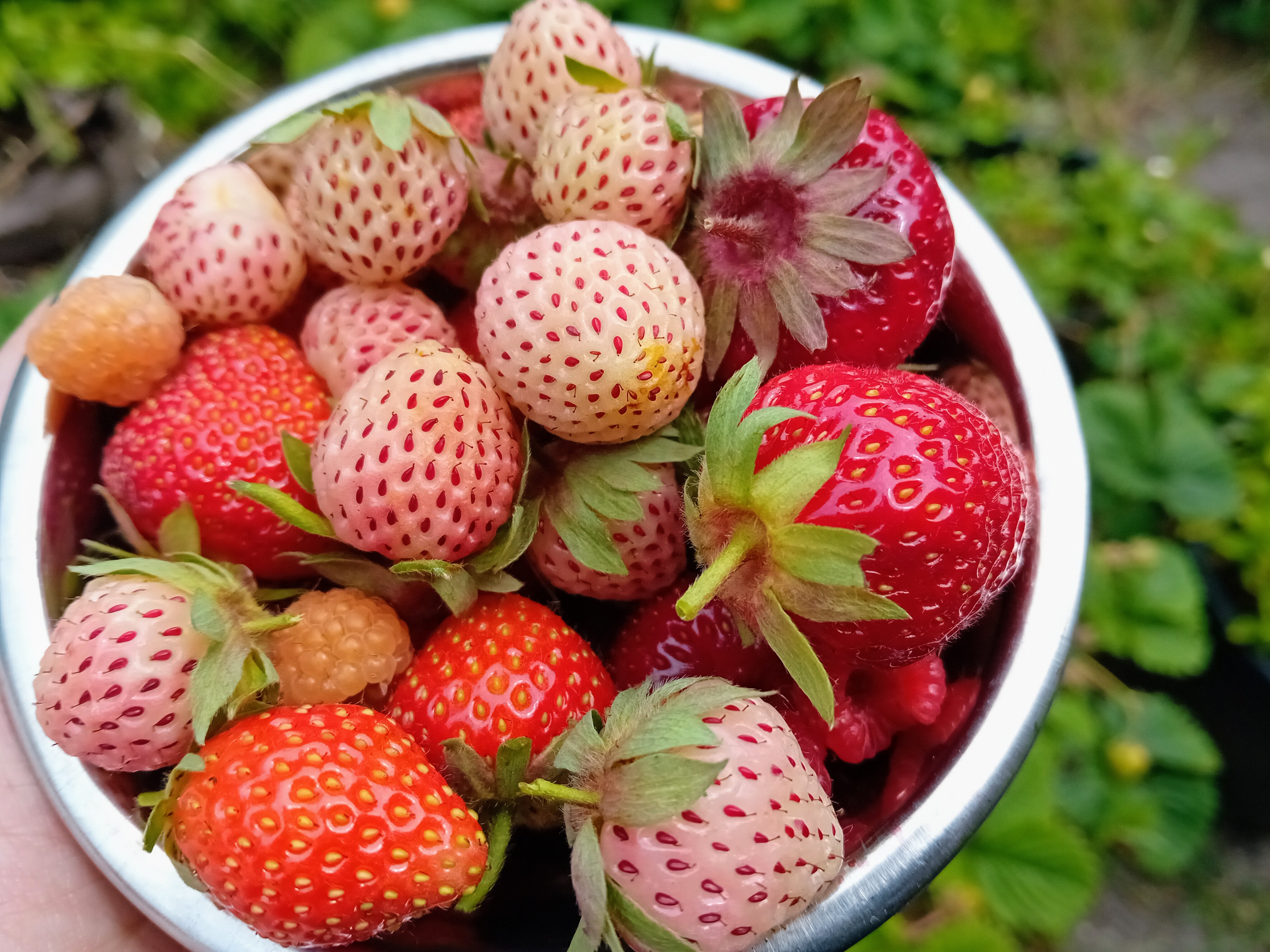 En een andere favoriet binnen ons gezin is de ananas aardbei, een modern ras wat opvalt met zijn witte kleur en rode zaadjes. Zoals je ook kan zien op onderstaande foto, oogsten we hier nu allerlei soorten door elkaar. (Met wat frambozen ertussen… en ja, die zijn er dus ook in verschillende kleuren!)