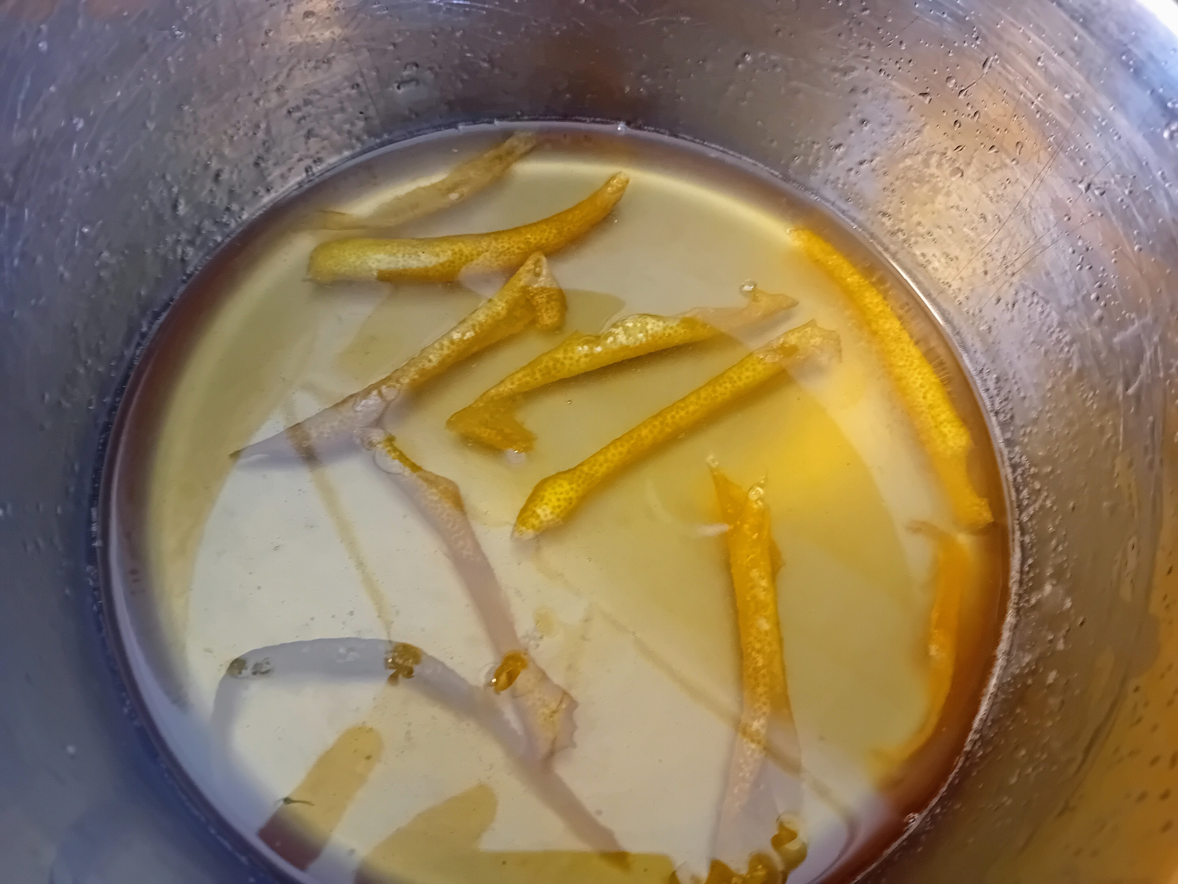 4. Haal dan de pan van het vuur af, en voeg dan de citroenschil toe.