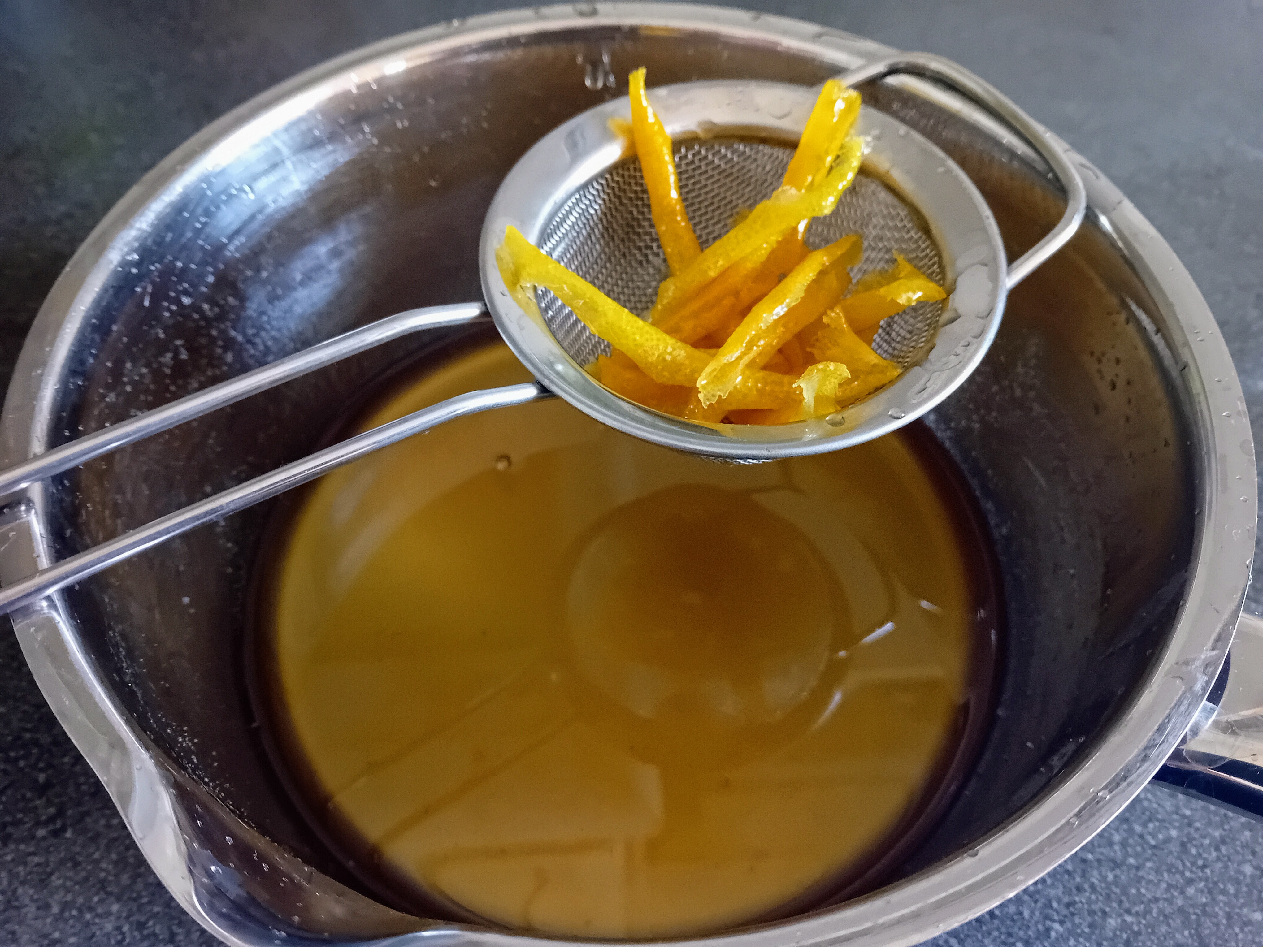 6. Haal de schillen uit de siroop. Laat ze wel even goed boven de siroop uitlekken, zodat er geen heerlijke siroop onnodig verloren gaat.