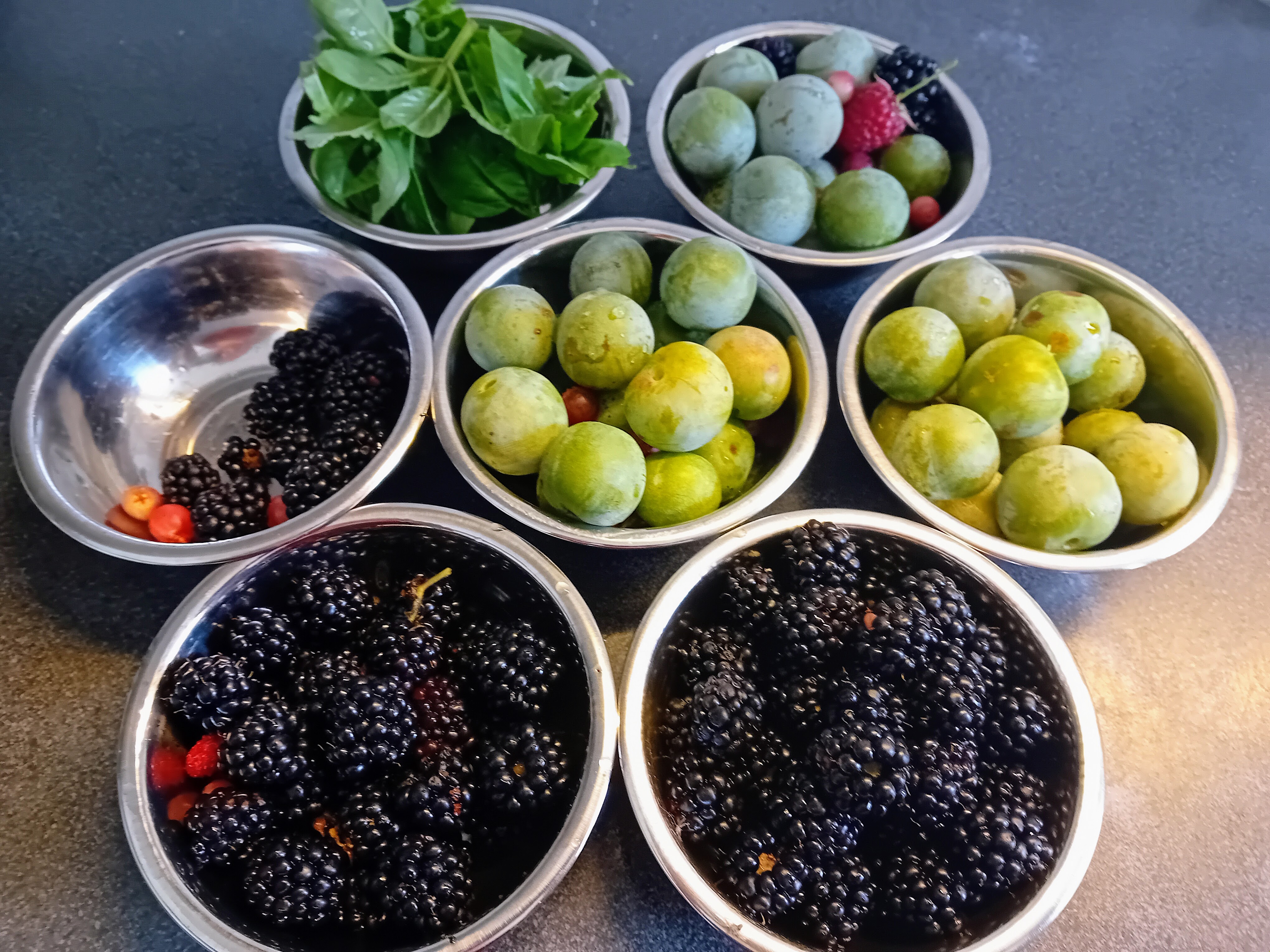 Verder hebben we een pruimenboom die ons kleine groene heerlijk zoete pruimen geeft, en hebben we nog een kleine hoeveelheid bosbessen, frambozen en bosaardbeien om te plukken.