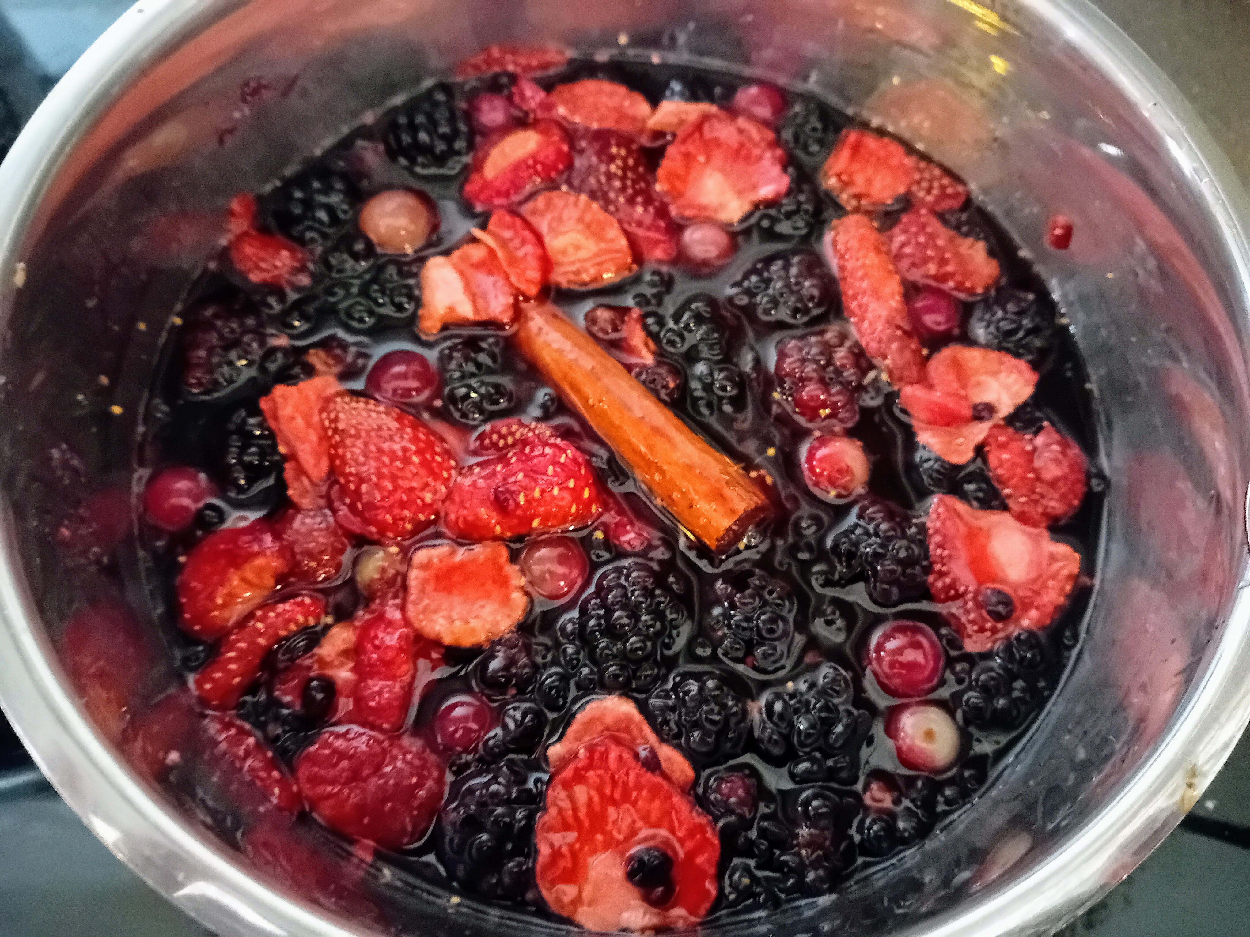 De vruchten worden overgoten met een ruime hoeveelheid water, daarna laten we het op het vuur een poosje pruttelen. Daardoor krijgt de drank een heerlijke volle natuurlijke bosvruchtensmaak.