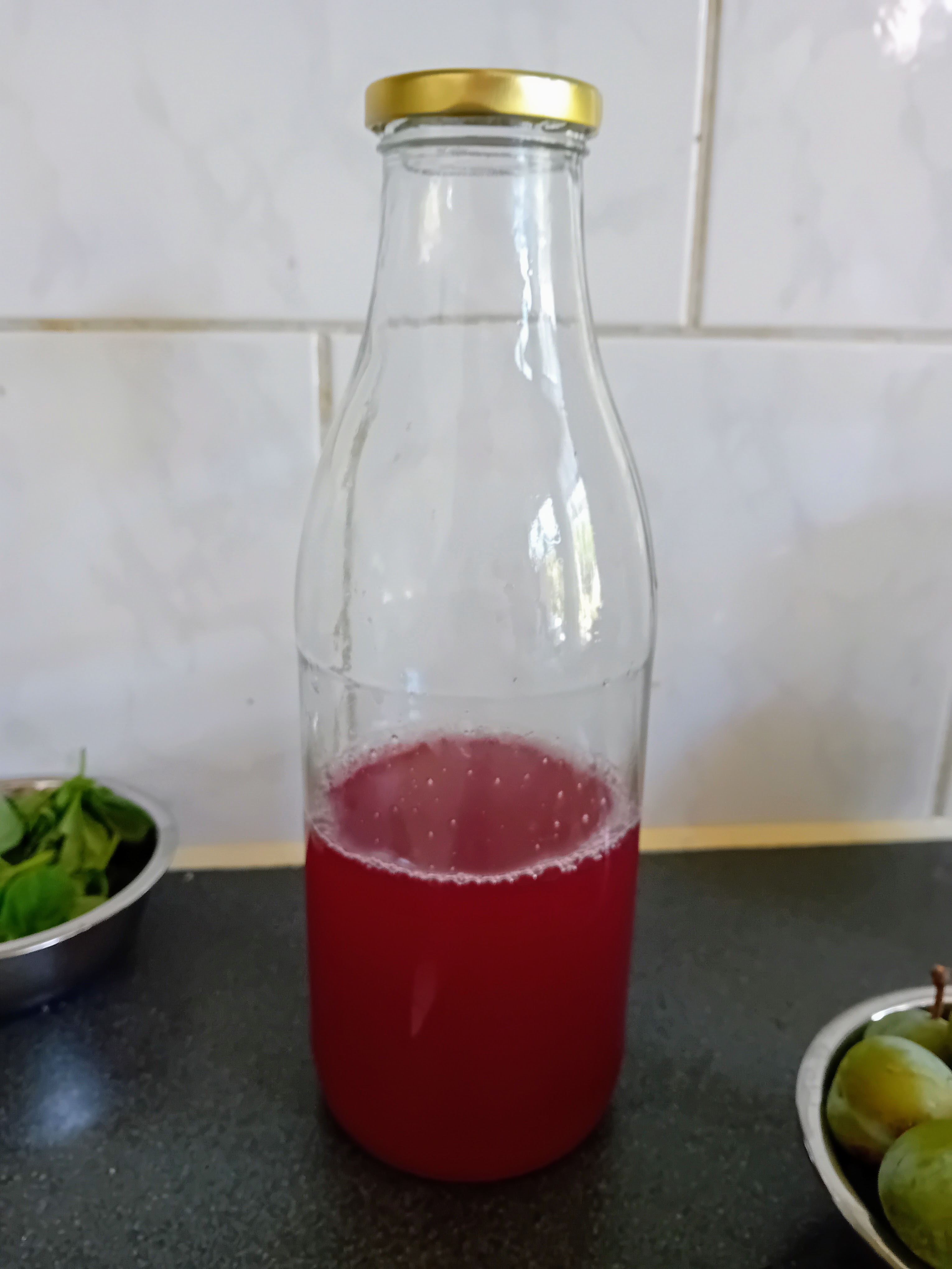 Maar eigenlijk is dat ook juist de reden waarom je deze drank een keer moet maken, want hij is zo lekker dat een volle fles fotograferen me elke keer niet lukt. Zodra ik aankondig dat ik dit ga maken, wordt er al gewacht op dit drankje. En als het dan afgekoeld is, verdwijnt het uit de koelkast en is ruim de halve fles weg, en ik mag van geluk spreken dat ik deze keer nog snel op de foto kon zetten, want achter me werd al ongeduldig geroepen dat ze wel meer wilden.