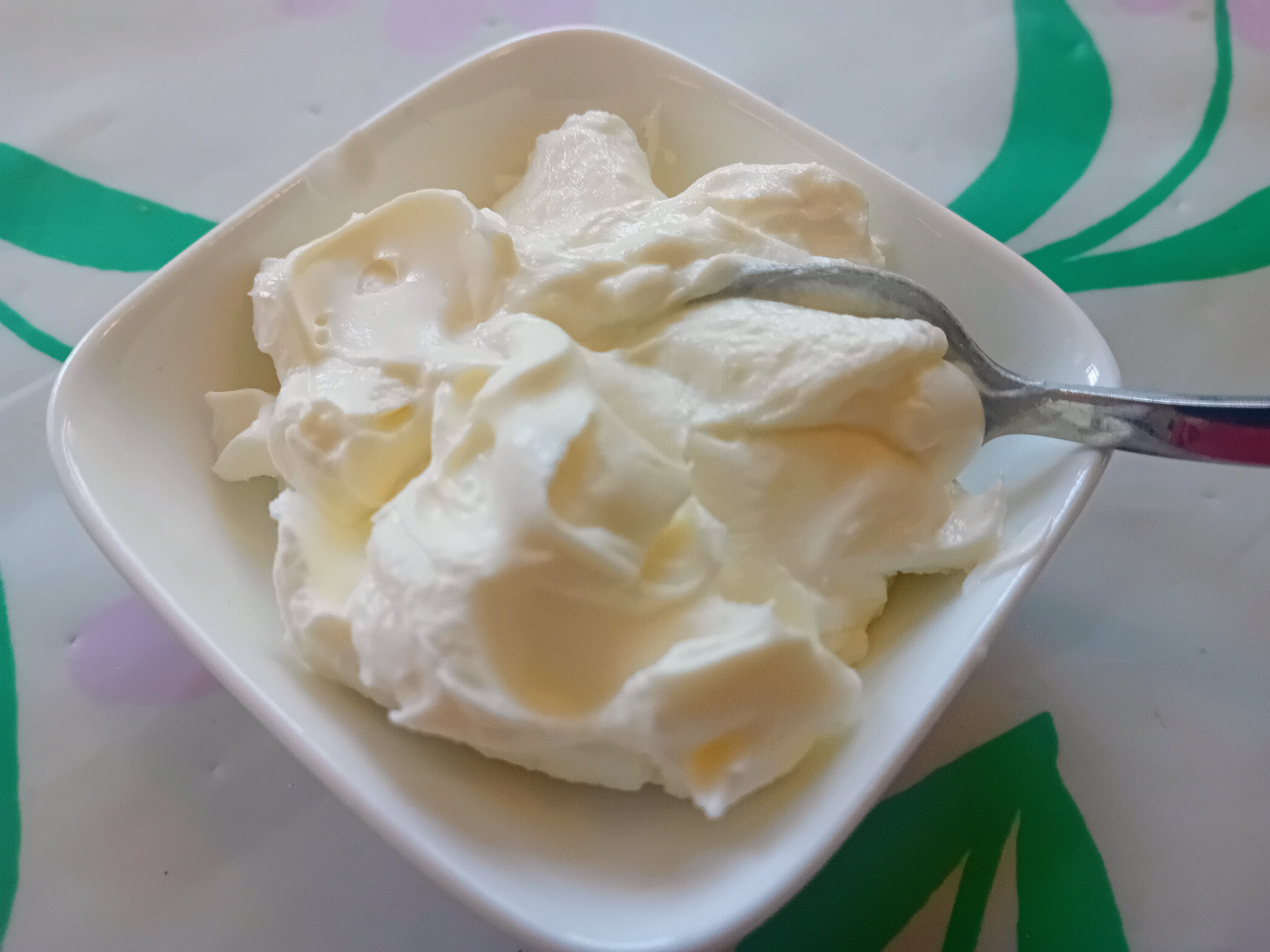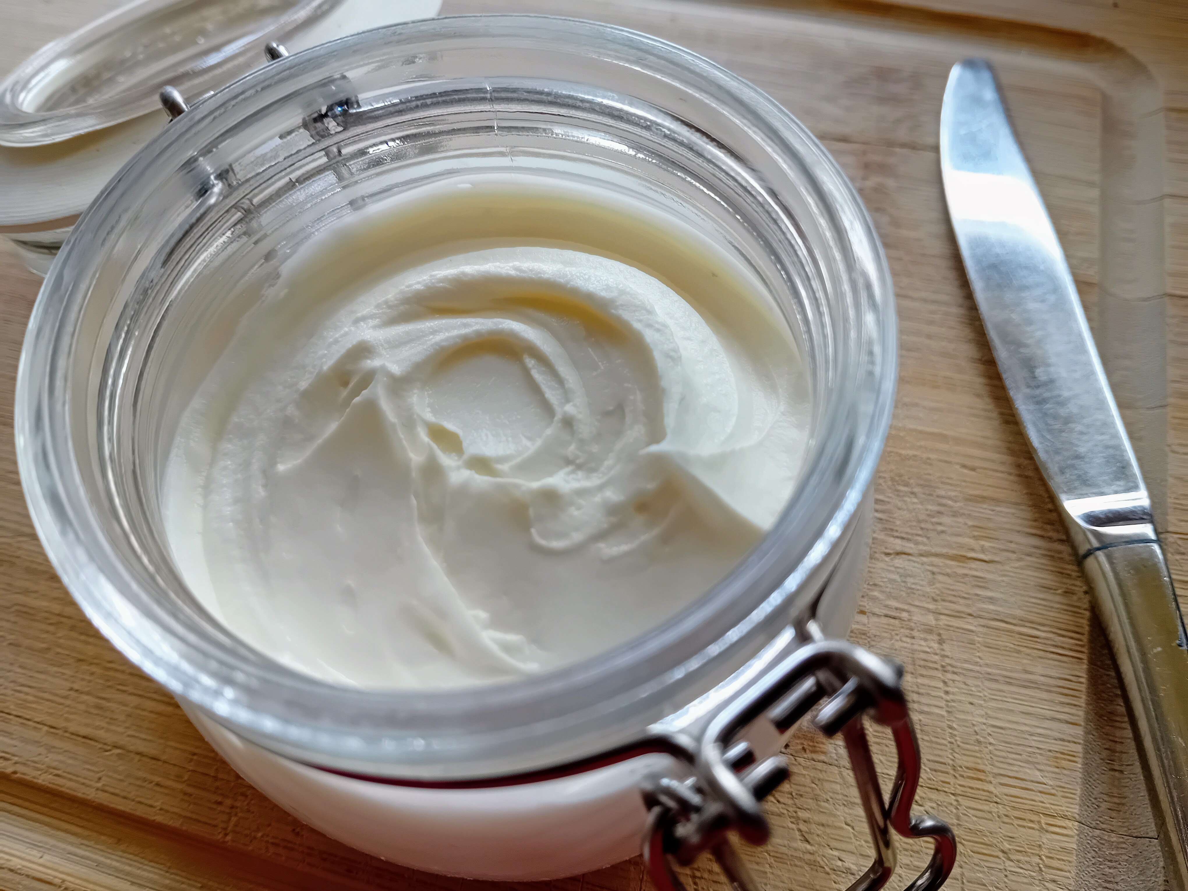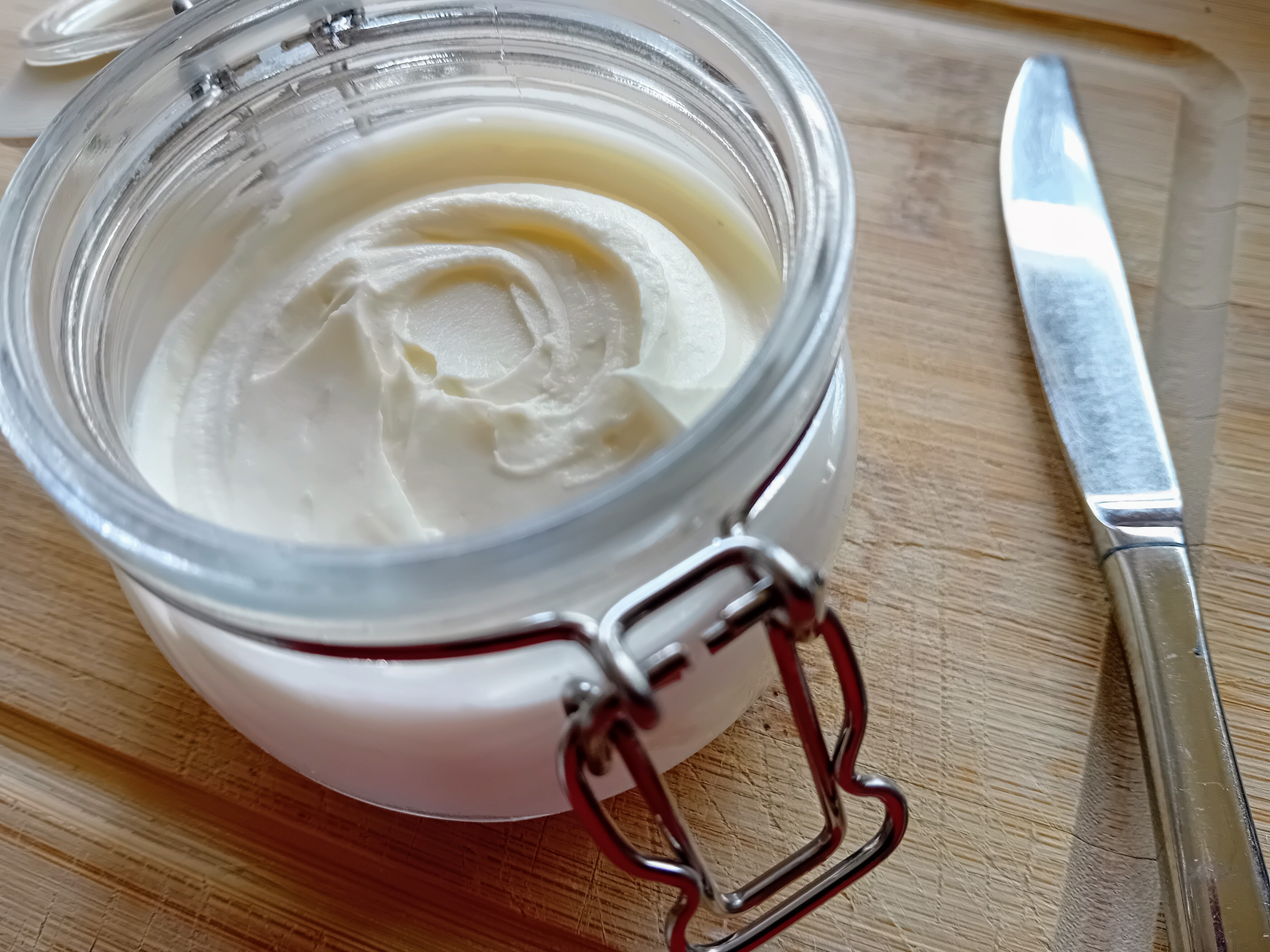 Als basis gebruik ik nu een volle yoghurt. Die wordt verder niet meer verhit, dus je profiteert ook nog eens van waardevolle probiotica door deze zuivelspread zelf te maken.