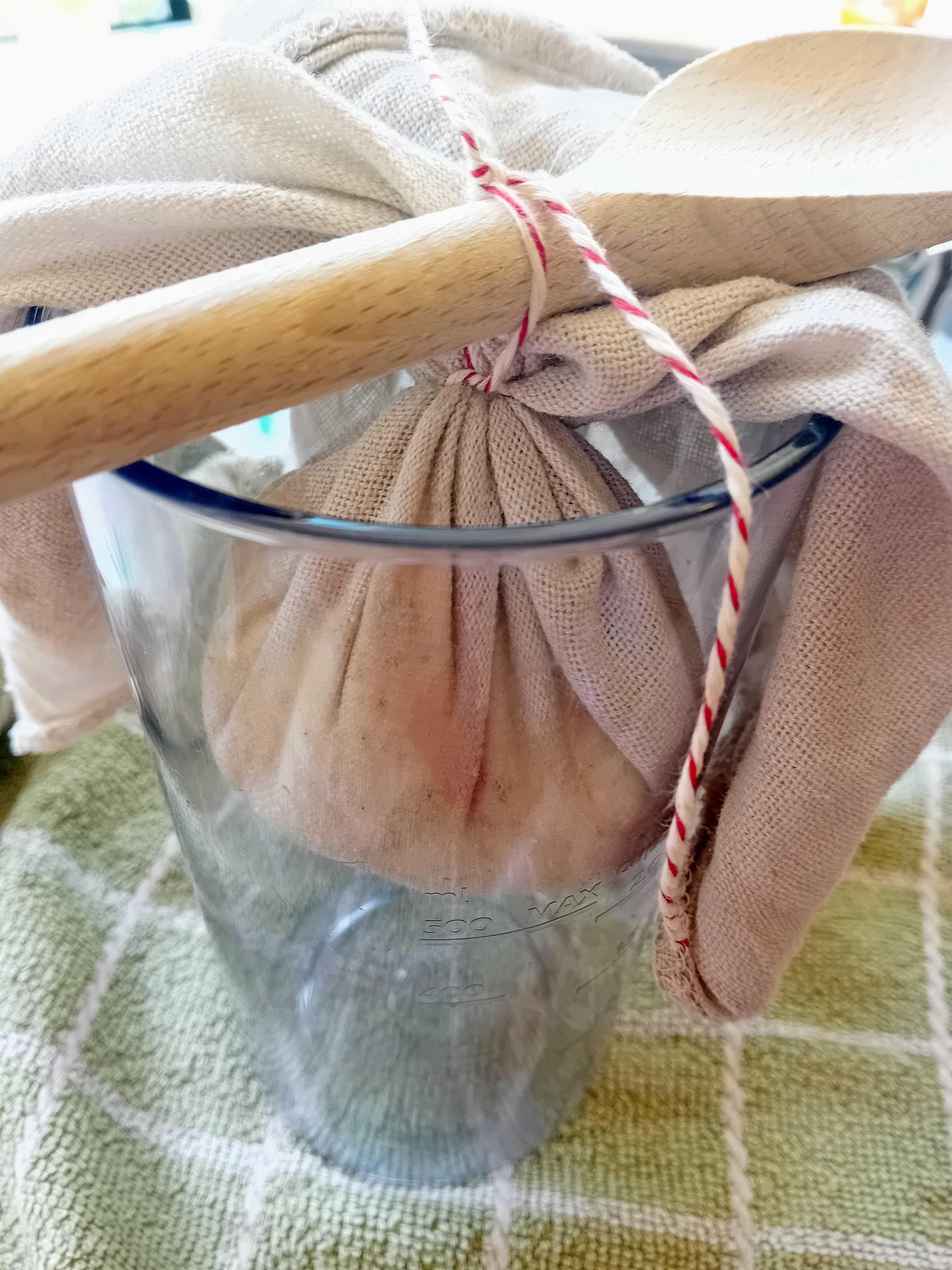 – Je kan dit recept ook maken zonder een zeef, door de yoghurt in de doek op te hangen (zie foto hieronder).