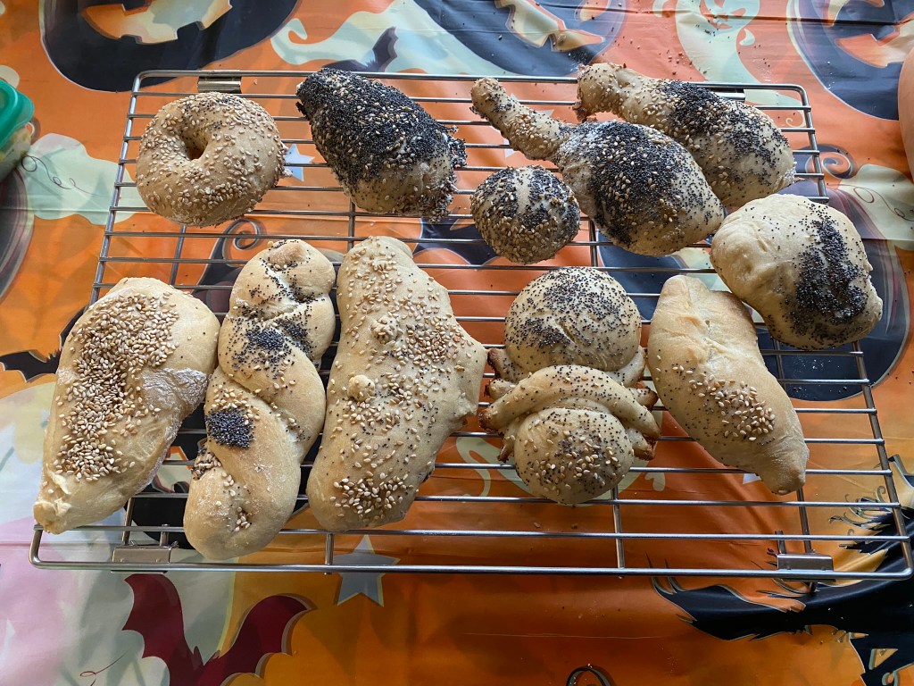 En er zijn volop andere creaties gemaakt, versierd met maanzaad en sesamzaadjes. Dit brooddeeg houdt zijn vorm heel goed, wat het ideaal maakt voor aparte creatieve broodjes.