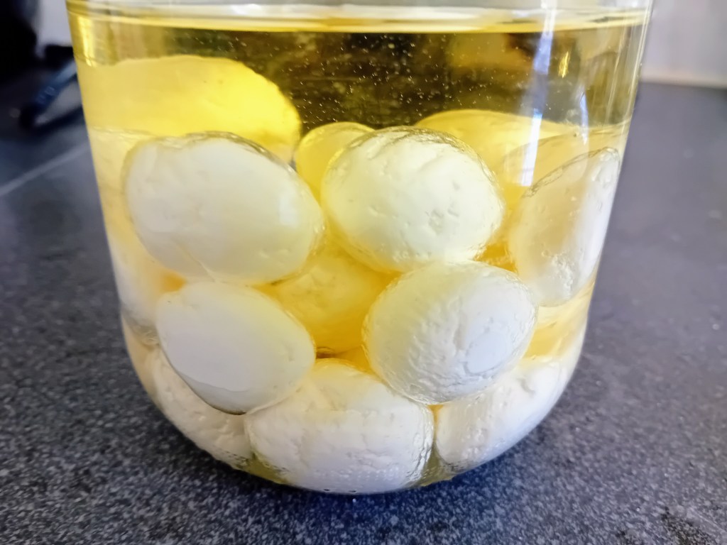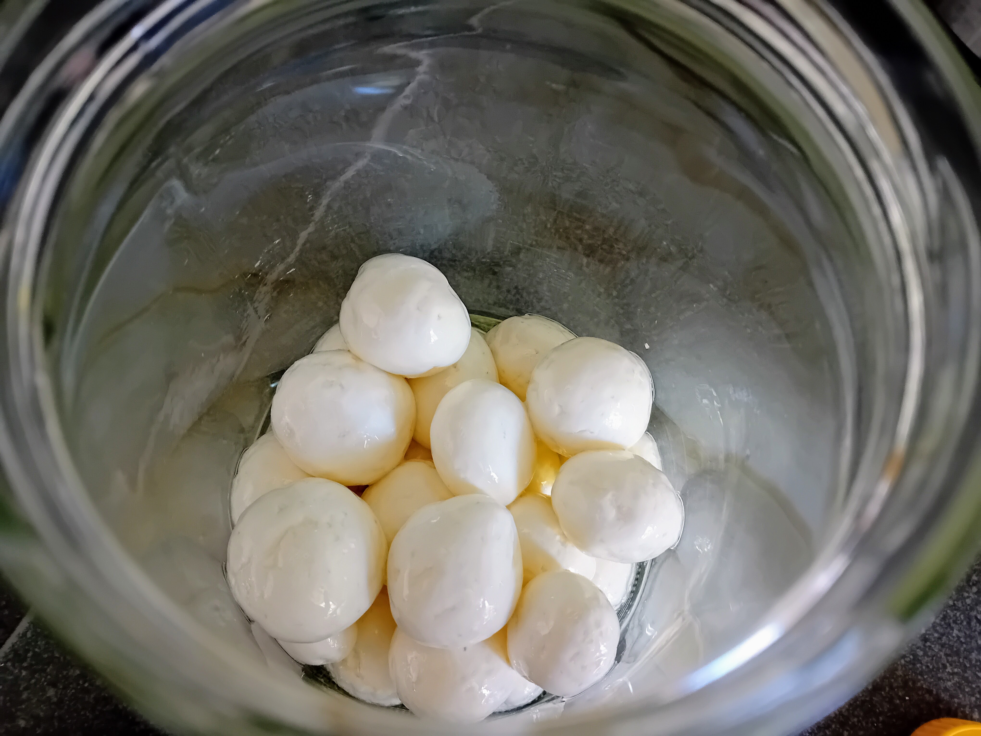 8. Giet dan olijfolie over de balletjes heen, zodat ze volledig bedekt zijn met olie. Voor de zekerheid giet ik er vaak nog een extra cm olie bovenop.